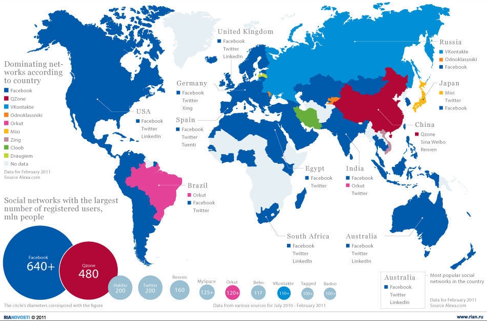 una infografía sobre qué red social se usa más en cada país (mapa 2/2011).