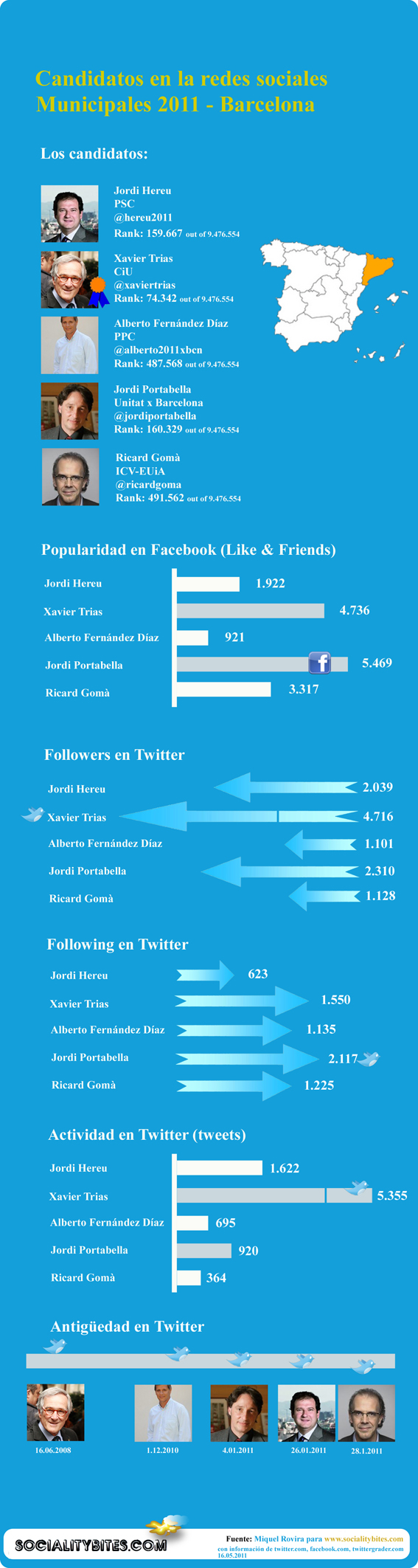 Una infografía sobre los candidatos al Ayuntamiento de Barcelona 2011 en las redes sociales. Vía www.socialitybites.com
