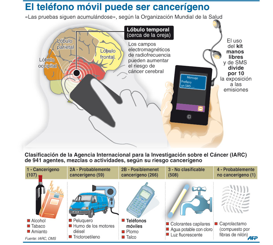 Una infografía que dice que el teléfono móvil puede ser cancerígeno.Vía noticias24.com
