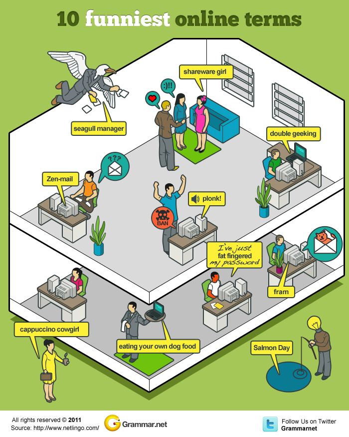 Una infografía sobre: Aprende inglés: 10 términos online divertidos. Vía grammar.net