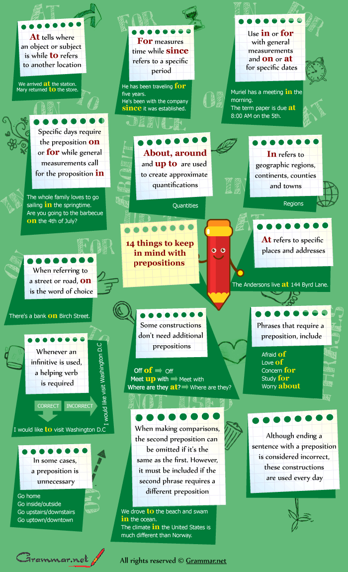 Una infografía sobre: Aprende inglés: 14 errores típicos con preposiciones.Vía grammar.net