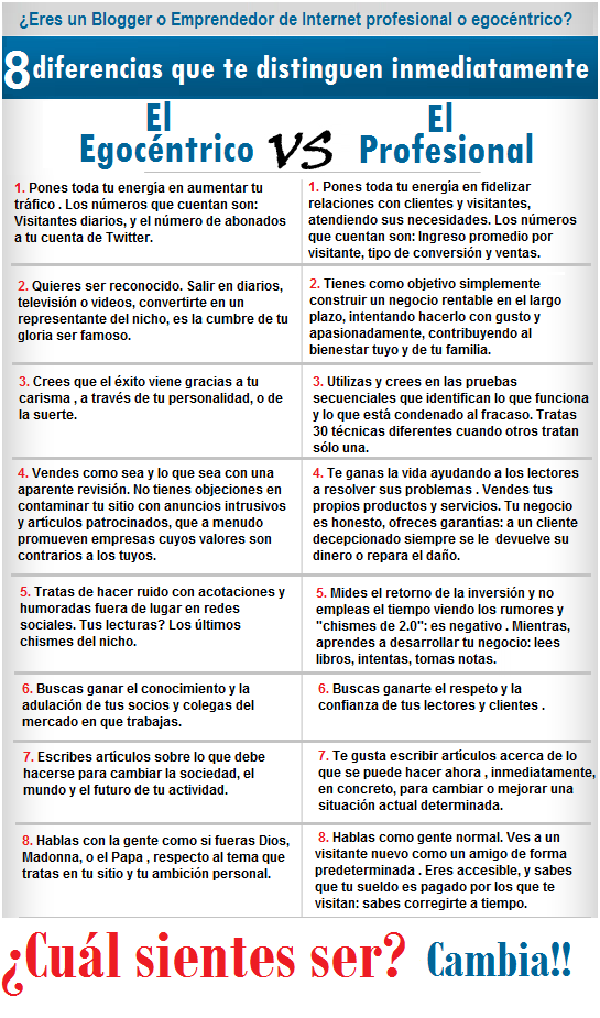 Una infografía que pregunta si ¿Eres un blogger o emprendedor de Internet porfesional o eres ególatra? Vía maeteriablogger.com