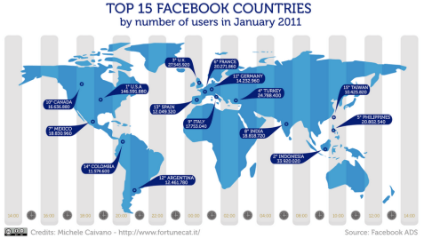 Una infografía sobre los 15 paises que más utilizan la red social FaceBook.